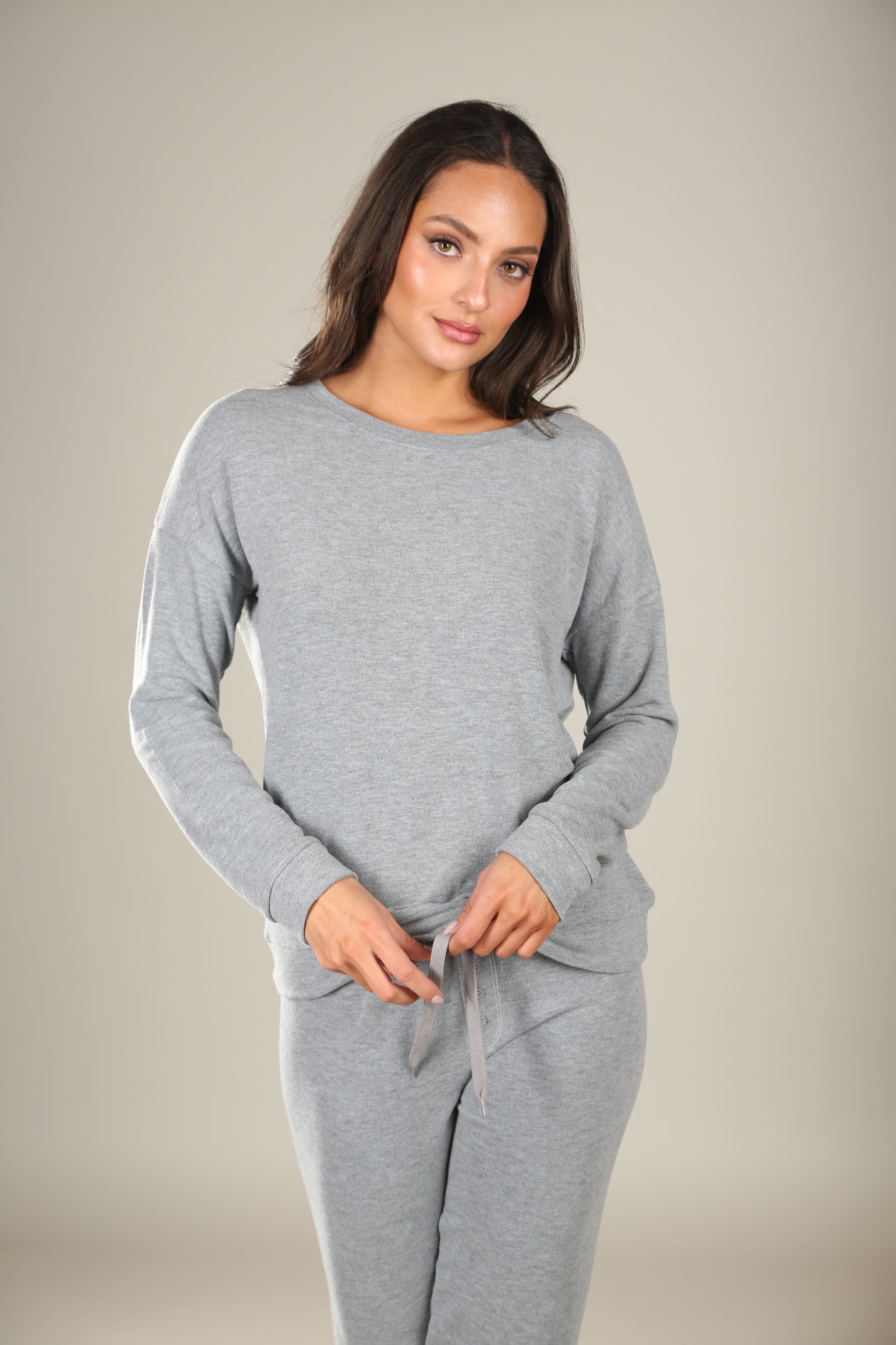 This cozy long sleeve top in Heather Gray color from our ASPEN DREAM iconic cozy collection combines warmth, elegance, and ultimate comfort with a subtle, chic appeal.Our cozy wide-leg pants in Heather Grey feature a flattering drape for a fit that's effortlessly chic and endlessly comfortable. Pair them with a T-shirt for lounging, a chunky sweater for casual outings, or the matching long-sleeve top from our cozy collection for a perfectly cohesive look.