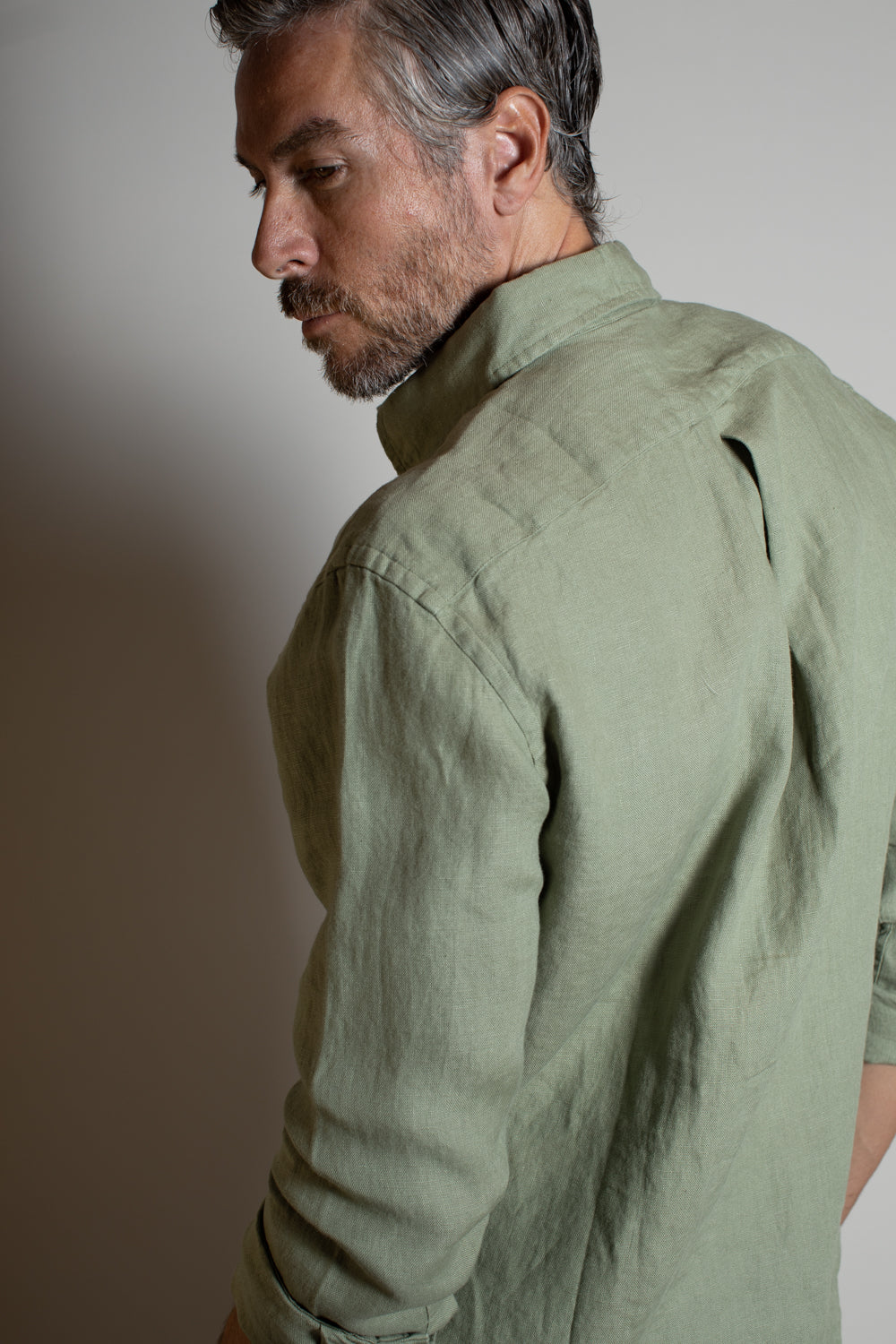 A natural linen button-down shirt made with sustainably-grown French linen and washed with biodegradable softeners.