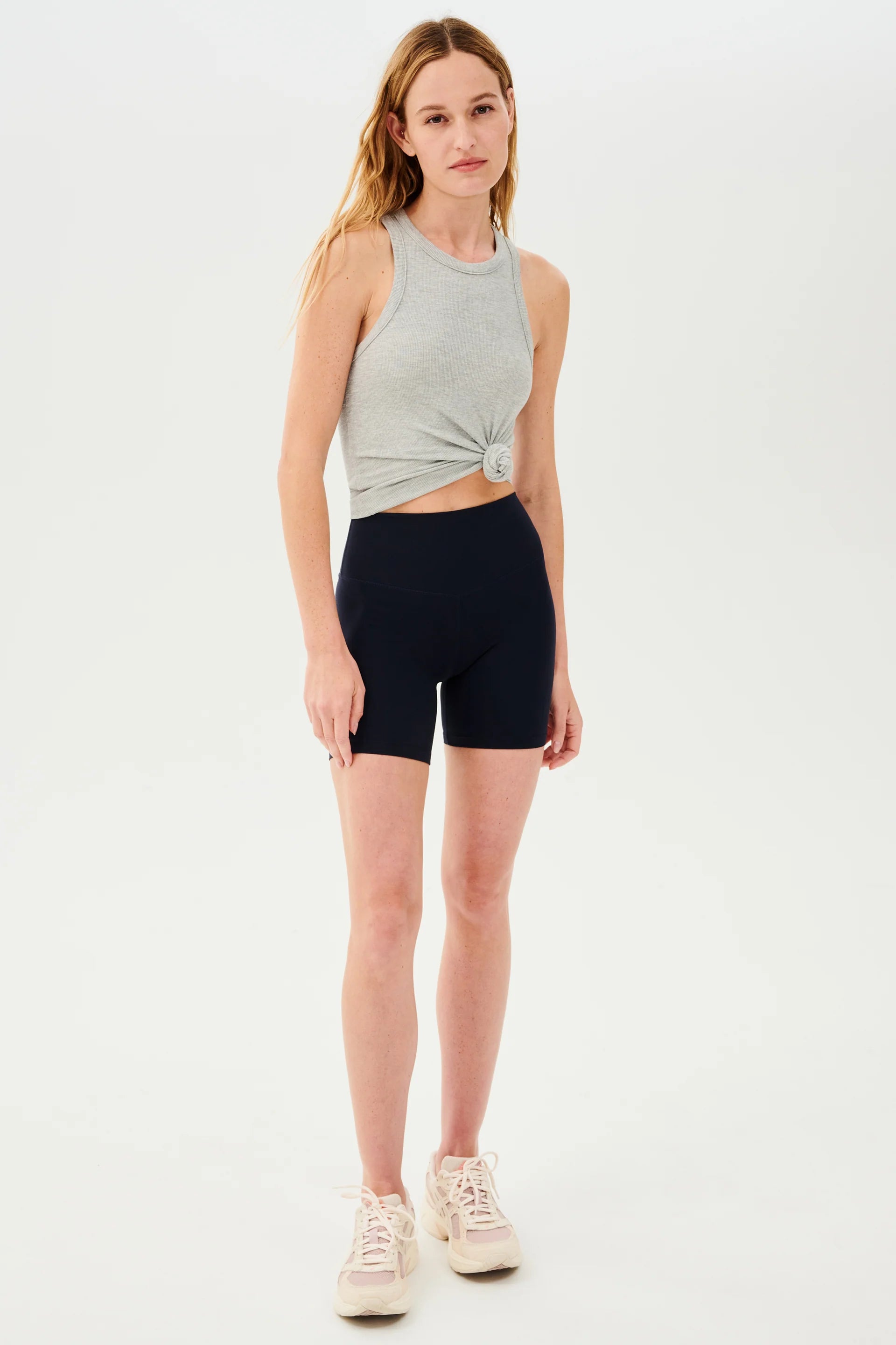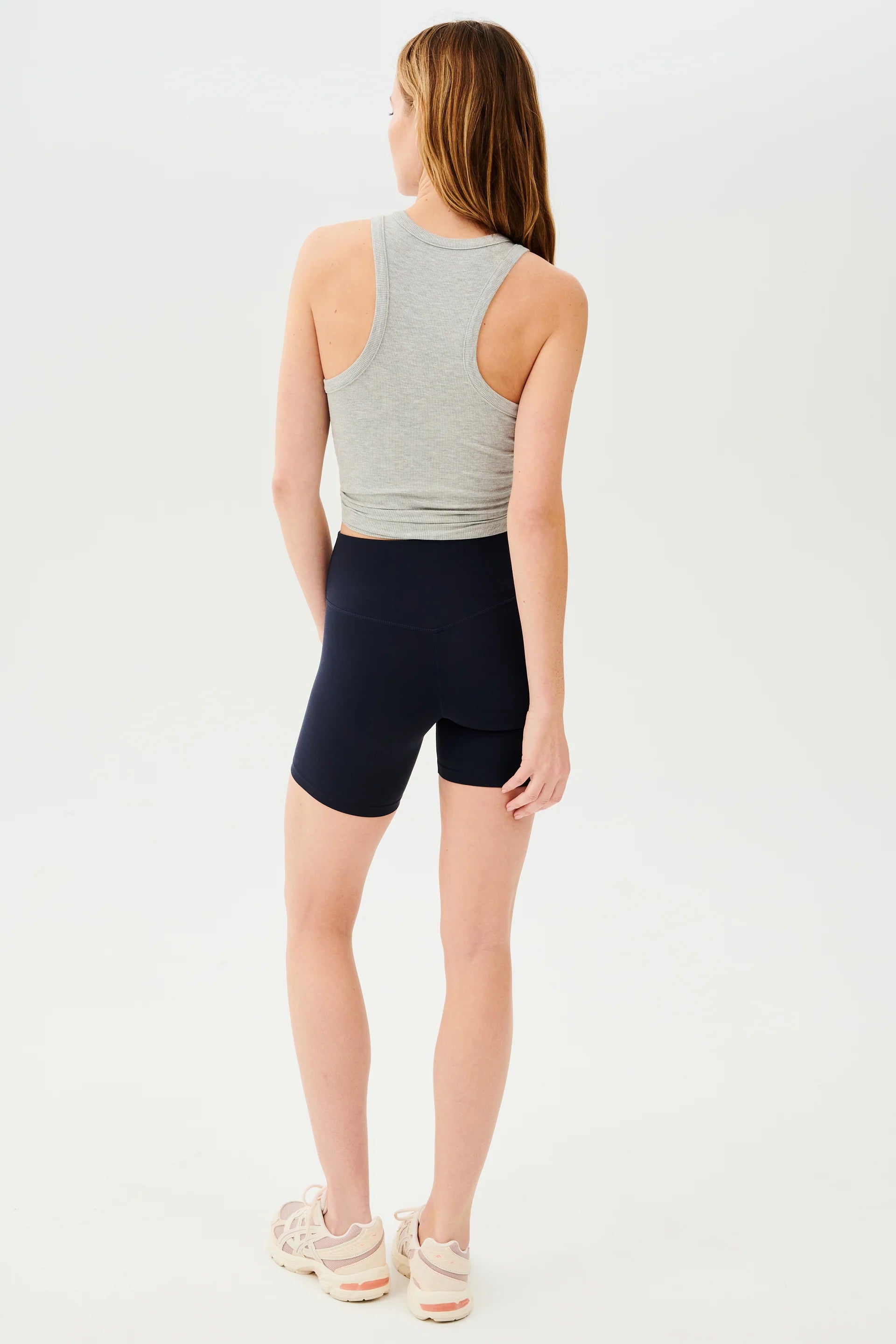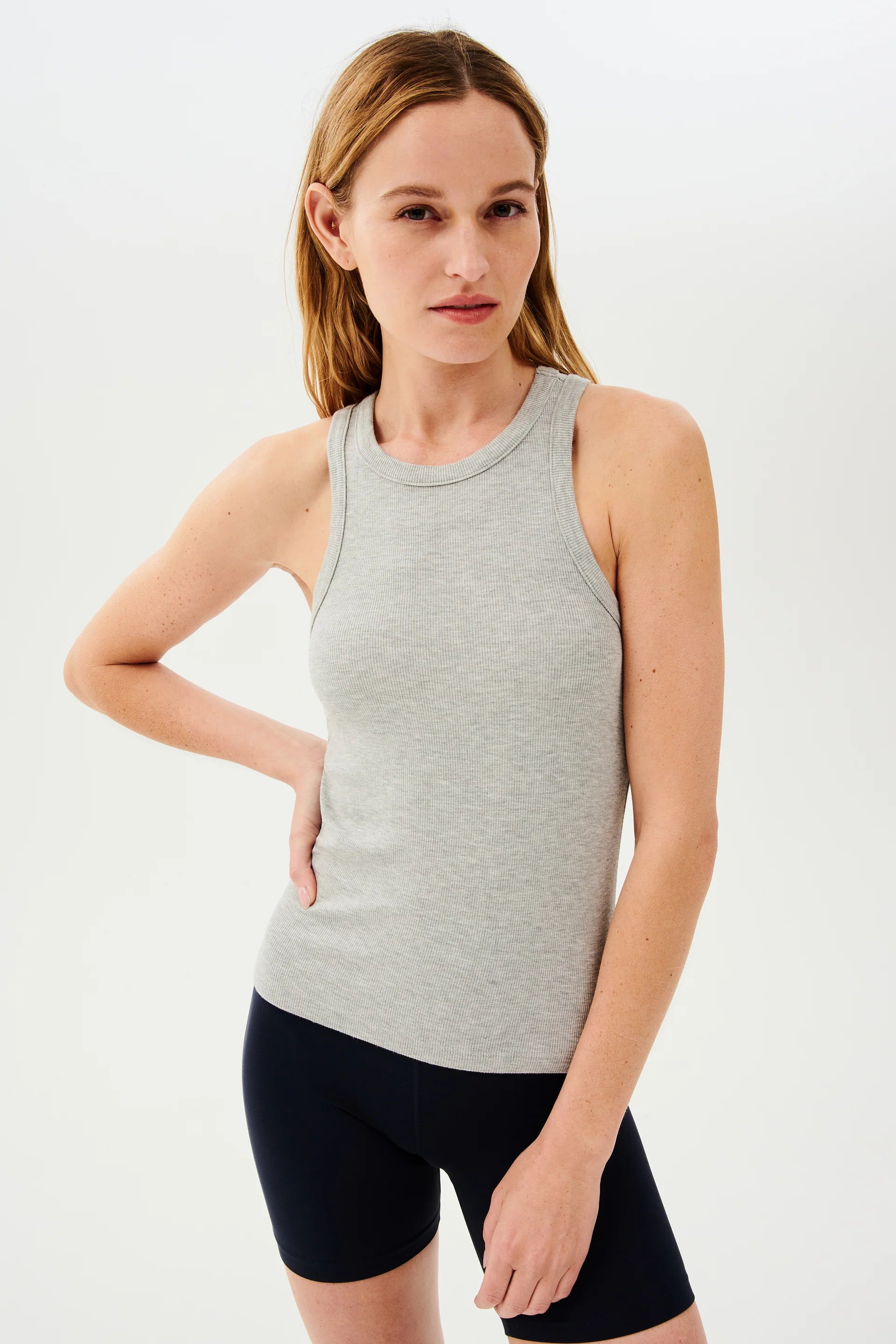 A high racer front and back neckline add a bit of sophistication to our classic tank. Super soft baby rib fabric to hug your body and layer effortlessly.