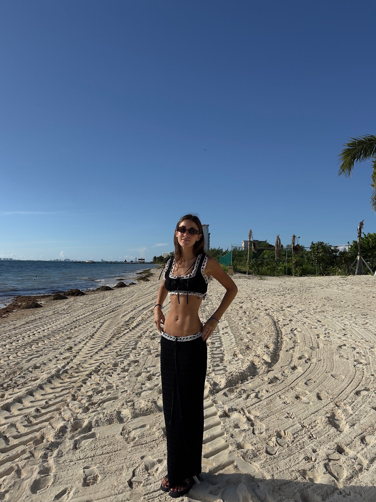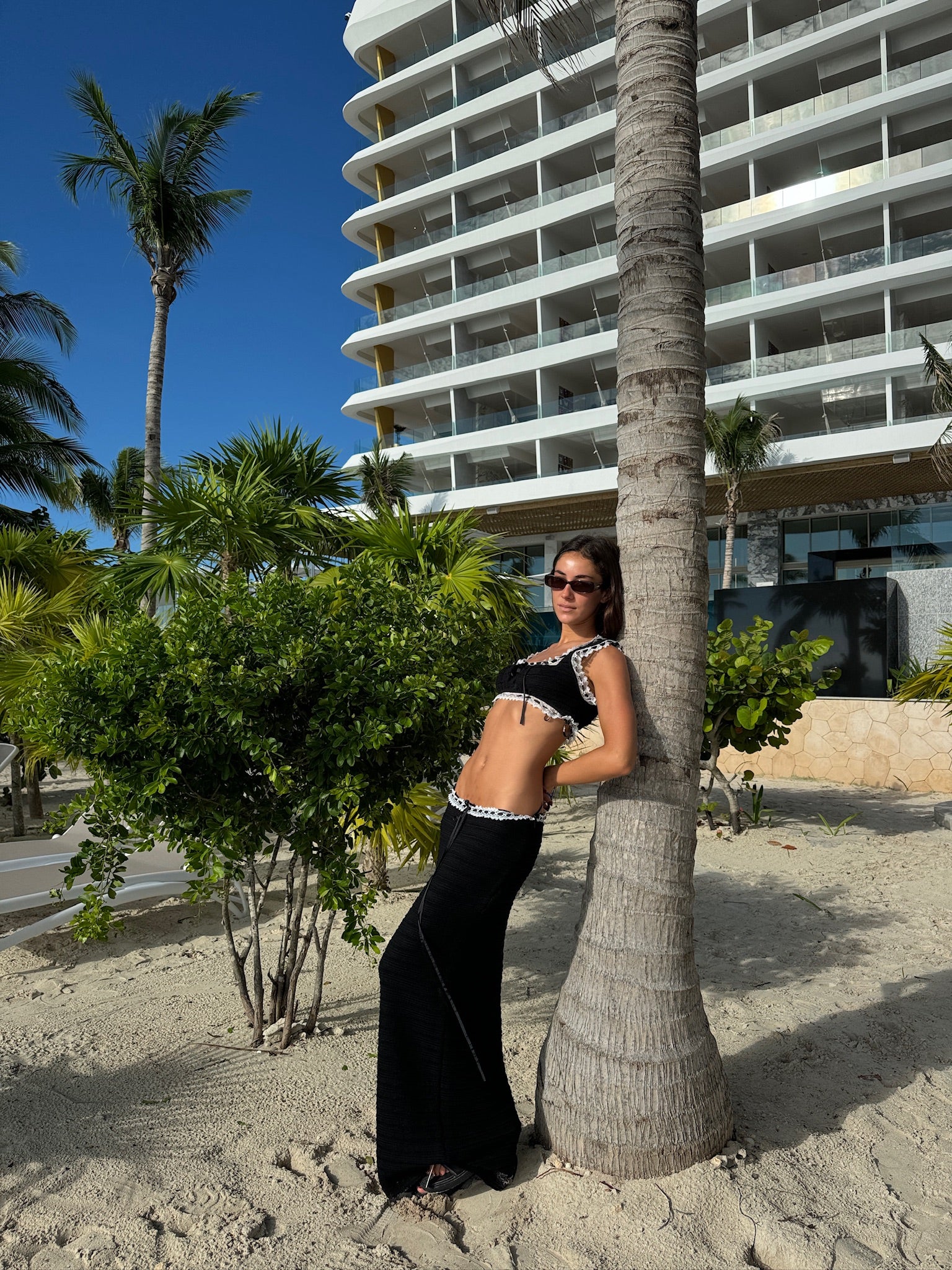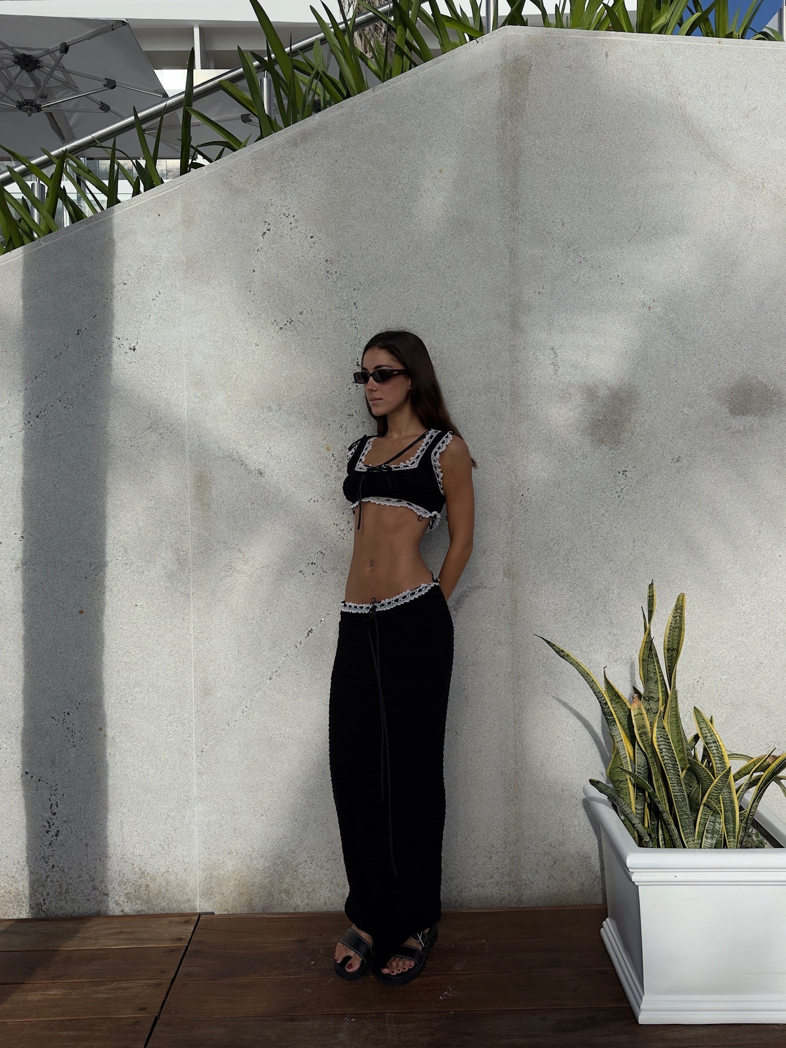 For undeniable elegance during the heat of summer, look no further than the Mayfair black crop top—a crochet cropped top with lace trims and slotted grosgrain ribbons around the neckline, straps, and hem. Pair it with the matching Mayfair Crochet Maxi Skirt for a co-ord set.
