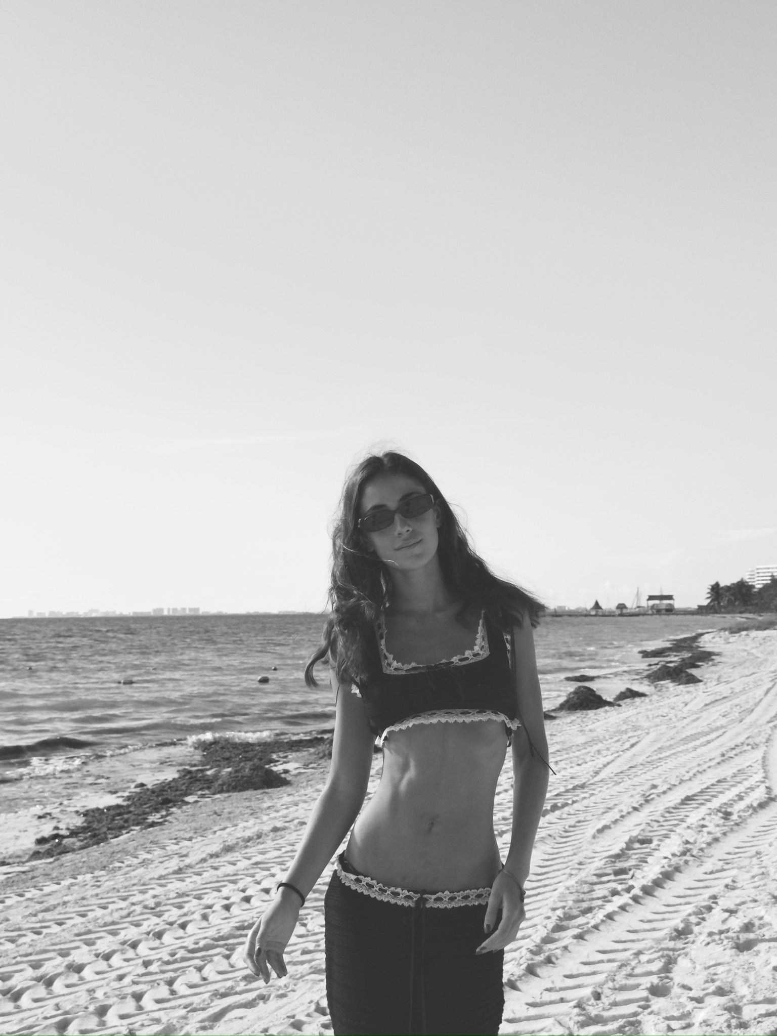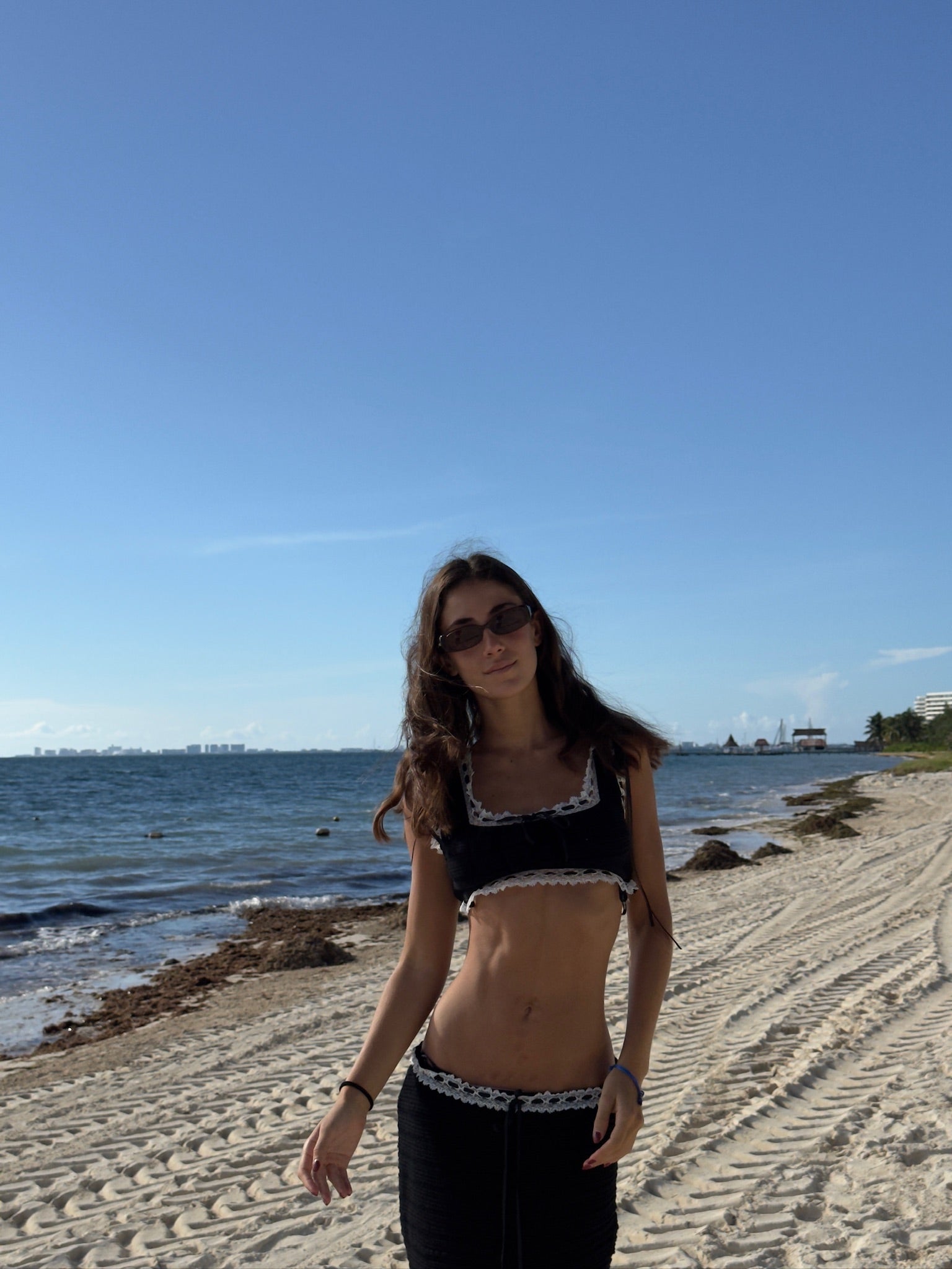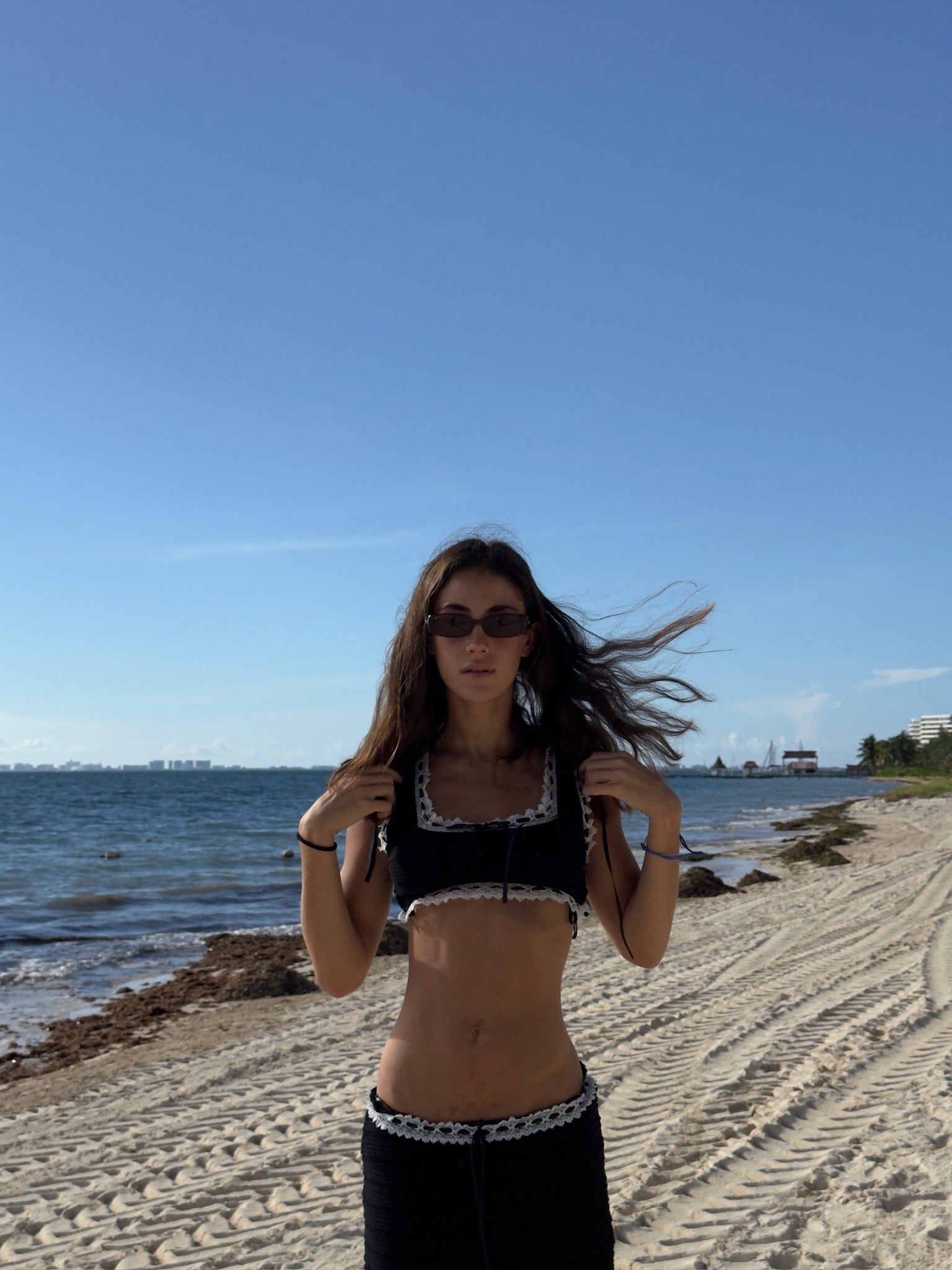 For undeniable elegance during the heat of summer, look no further than the Mayfair black crop top—a crochet cropped top with lace trims and slotted grosgrain ribbons around the neckline, straps, and hem. Pair it with the matching Mayfair Crochet Maxi Skirt for a co-ord set.